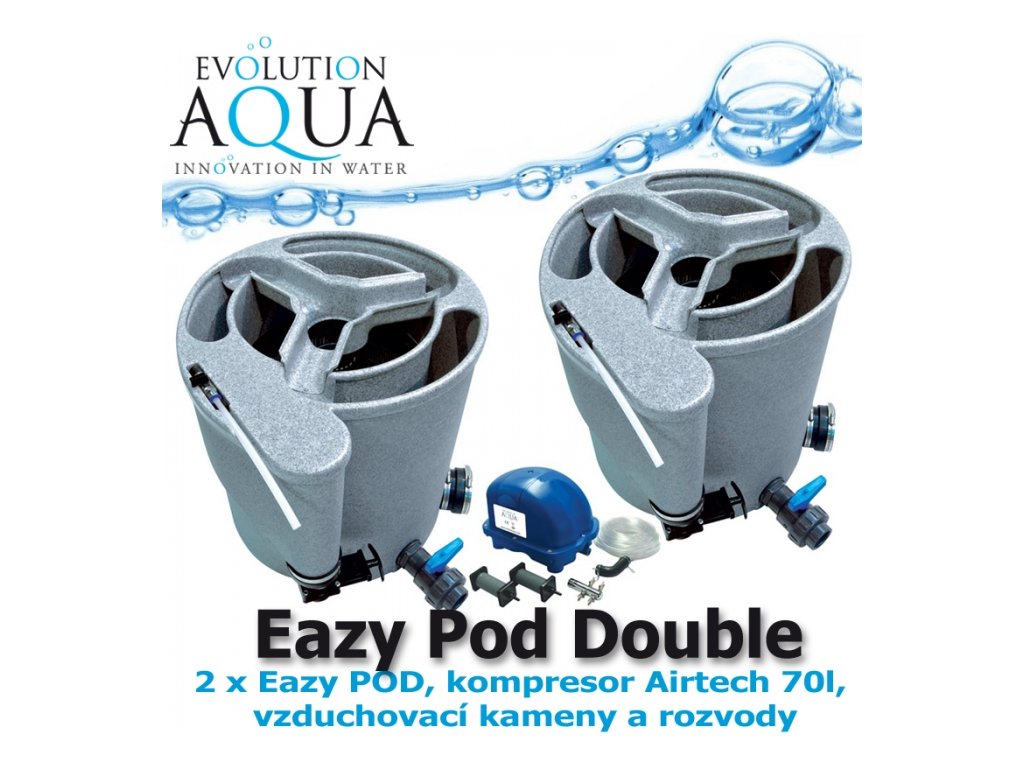 Sestava EAZY PO AIR DOUBLE obsahuje: 2x mechanickou filtrační jednotku-Nexus Eazy Pod, medium K1 30 litrů do mechanicko-biologické části, odpadní a výpustní kohout, vstupní a výstupní flexibilní PVC spojky, vstupní Valtera uzávěra, 2x víko na zakrytí filtrace a 1x kompresor Airtech 70 litrů + vzduchovací rozvody, kohoutky a vzduchovací kameny.