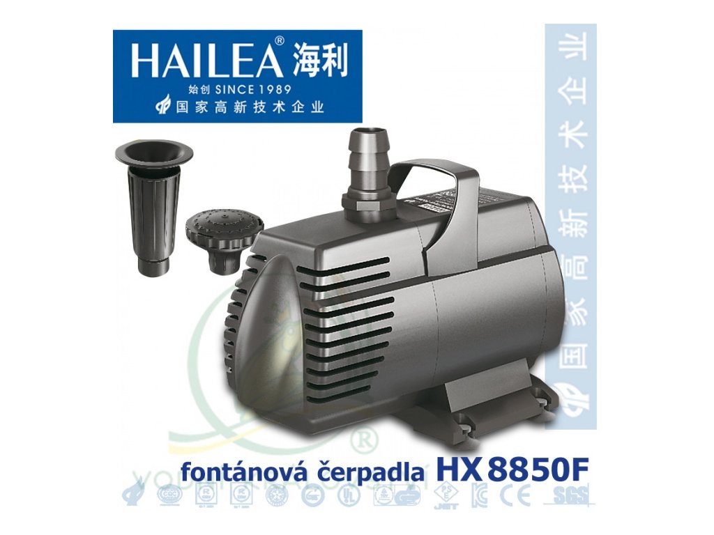Fontánové čerpadlo Hailea HX-8850F, 4900 litrů/hod, max. výtlak 3,3 m, 110 W s fontánovými nástavci a kabelem 10 metrů