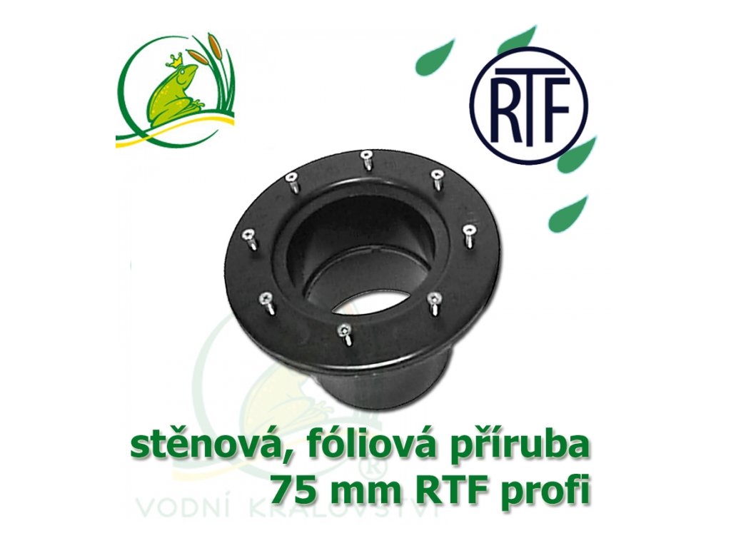 PVC fóliová, stěnová přiruba extra silná, model RTF 75 mm pro průchody fólií a EPDM, vhodná na stěny filtrací, šachet, nádrží. Připojení lepením na PVC 75 mm a nebo šedé lepící odpadní potrubí, připadně pouze spojovat se šedými odpadními trubkami, bez lepení. Přiruba je extra přizpůsobená pro oboustranné dotěsnění tmely, nebo EPDM-kaučukovým tmelem. Příruba je dodávána s dlouhými a extra kvalitními nerez šrouby. Model RTF je vhodný i pro extra zatížené použití a do velkých tlaků, v řádech desítek bar.