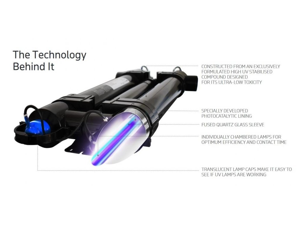 speciální vnitřní obložení těchto UV-C jednotek působí jako katalyzátor přeměny UV-C světla na hydroxylové radikály