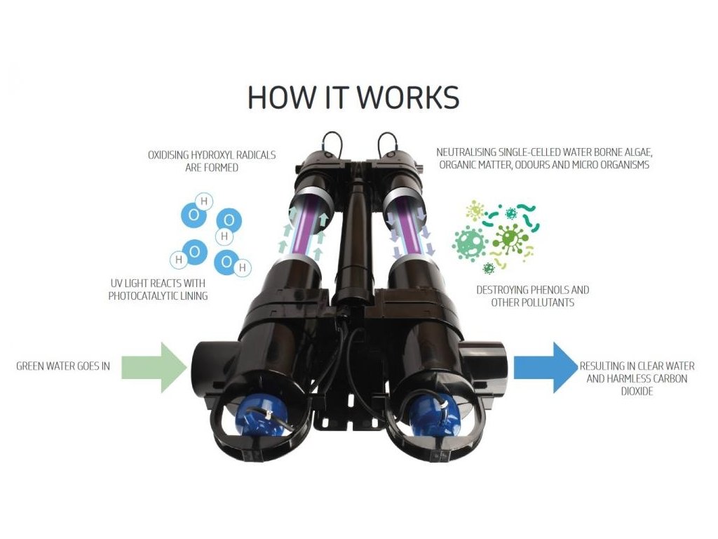 Jezírková UV lampa proti zelené vodě. Nejnovější fotokatalyticky vylepšená UV technologie je Pro Pond Titan UV. Lampa, až 1,5 krát účinnější než standardní UV lampa, produkuje hydroxylové radikály, které zlepšují čirost vody pomocí oxidace.